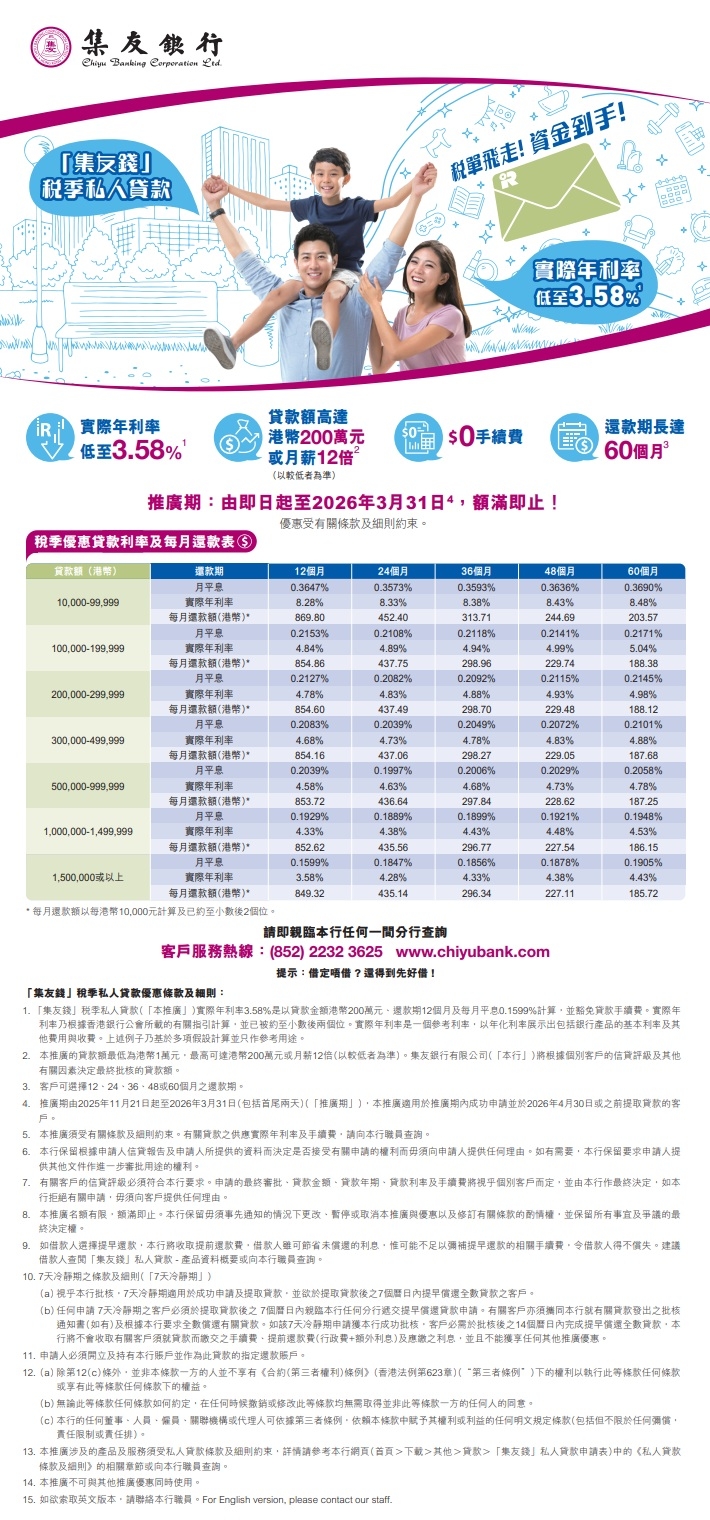 提示:借定唔借?還得到先好借!受優惠條款及細則約束。