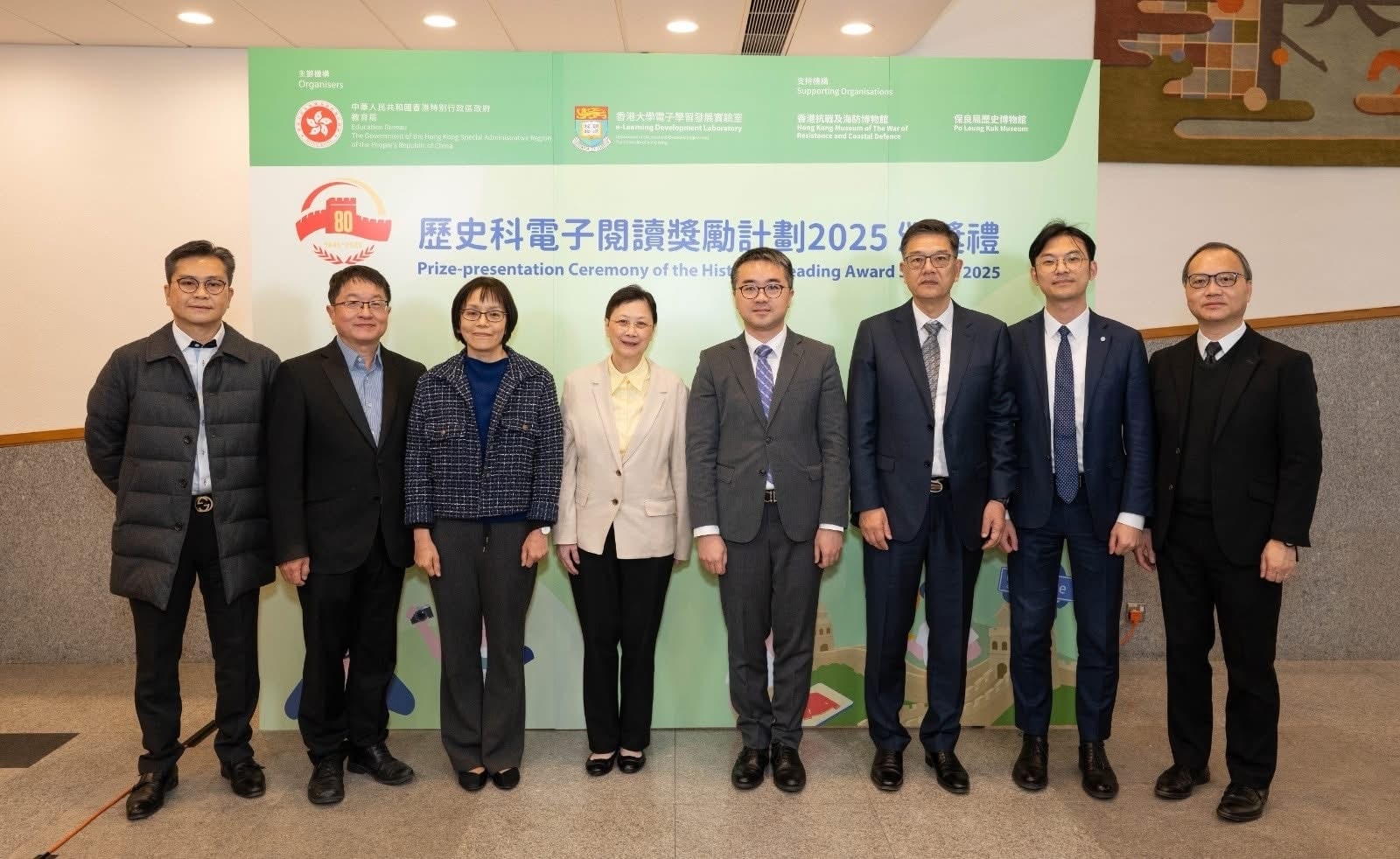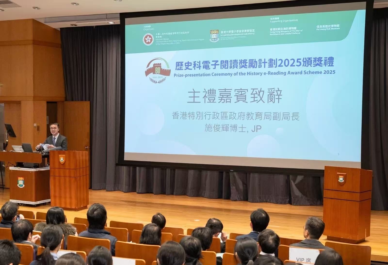 近日,由香港特別行政區政府教育局舉辦的「歷史科電子閱讀獎勵計劃2025」頒獎禮於香港大學黃麗松講堂舉辦。香港特別行政區政府教育局副局長施俊輝博士,香港大學副校長(國際創新中心)任詠華教授,集友銀行行政總裁、集友陳嘉庚教育基金主席徐俊出席典禮並擔任頒獎嘉賓。